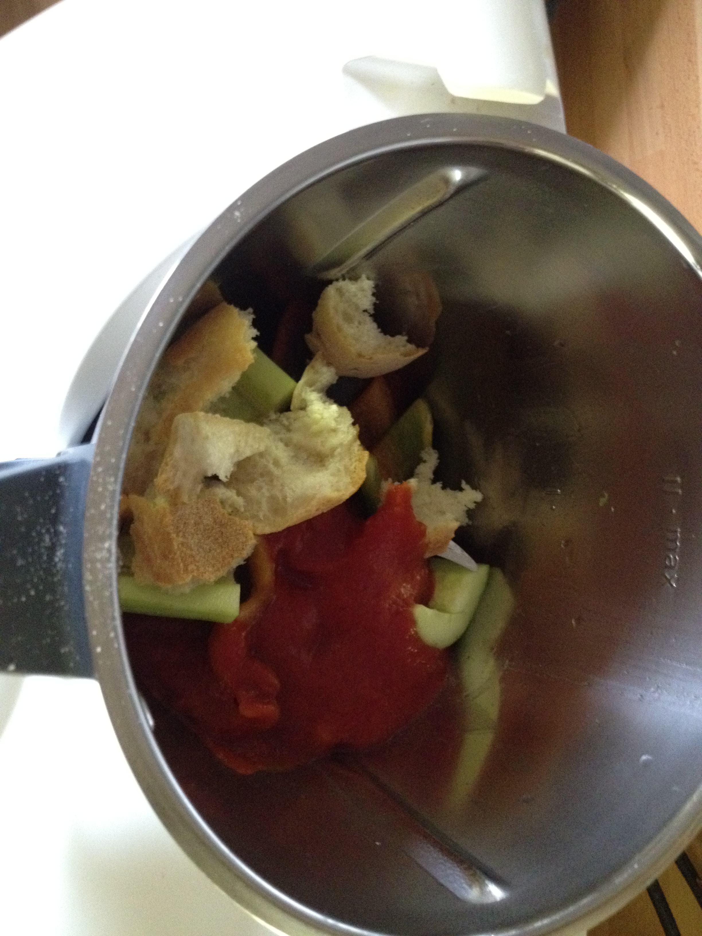 assato di pomodo,peperone, cetriolo. il pane a pezzetti,sale, peperoncino, pepe e un cucchiaio di olio. Frullare 15 sec, vel 7. Unire la gelatina sciolta in 30 gr di acqua calda: frullare 5 sec, vel3.Strofinare gli stampini con uno spicchio di aglio e versare il composto. Lasciare riposare il composto almeno 3/4 ore in frigorifero.