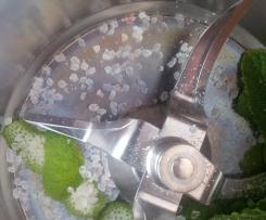 "coperchio chiuso" pulito mettete al interno il sale grosso rosa la buccia di un lime senza parte bianca e le foglie di menta e tritare il tutto per 10 Sec Vel 10 radunate con la spatola e se ci fosse bisogno di ritirare ancora un po'