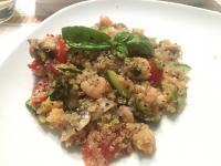 "antiorario" 5. Versare il condimento nel piatto con la quinoa mescolare bene ed aggiungere le foglioline di basilico o il pesto, amalgamare..lasciare a temperatura ambiente fino al completo raffreddamento e poi in frigo!