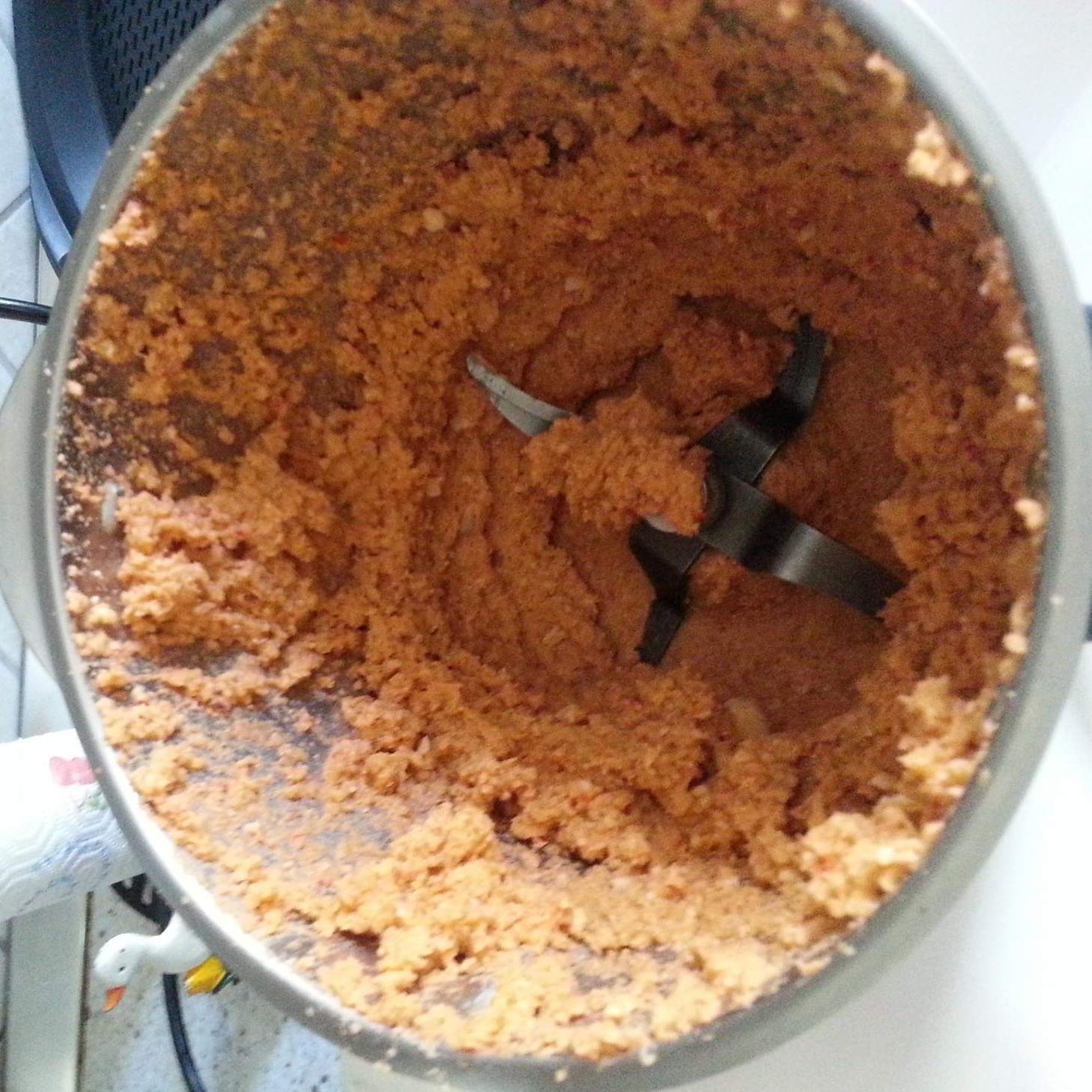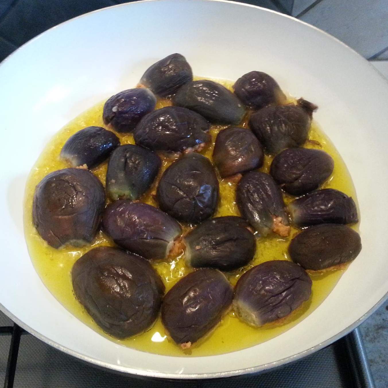 "coperchio chiuso" freddo tutti gli ingredienti del ripieno più la polpa delle melanzane e frullare V8 finché il composto non risulta cremoso. Con la spatola recuperare il composto e riempire le metà di melanzana fredde.Mettere in una padella con abbondante olio caldo con il ripieno a contatto con l'olio e girare quando ha fatto la crosticina. Lasciar rosolare qualche minuto e mettere in un piatto con carta assorbente. Servire caldo o freddo