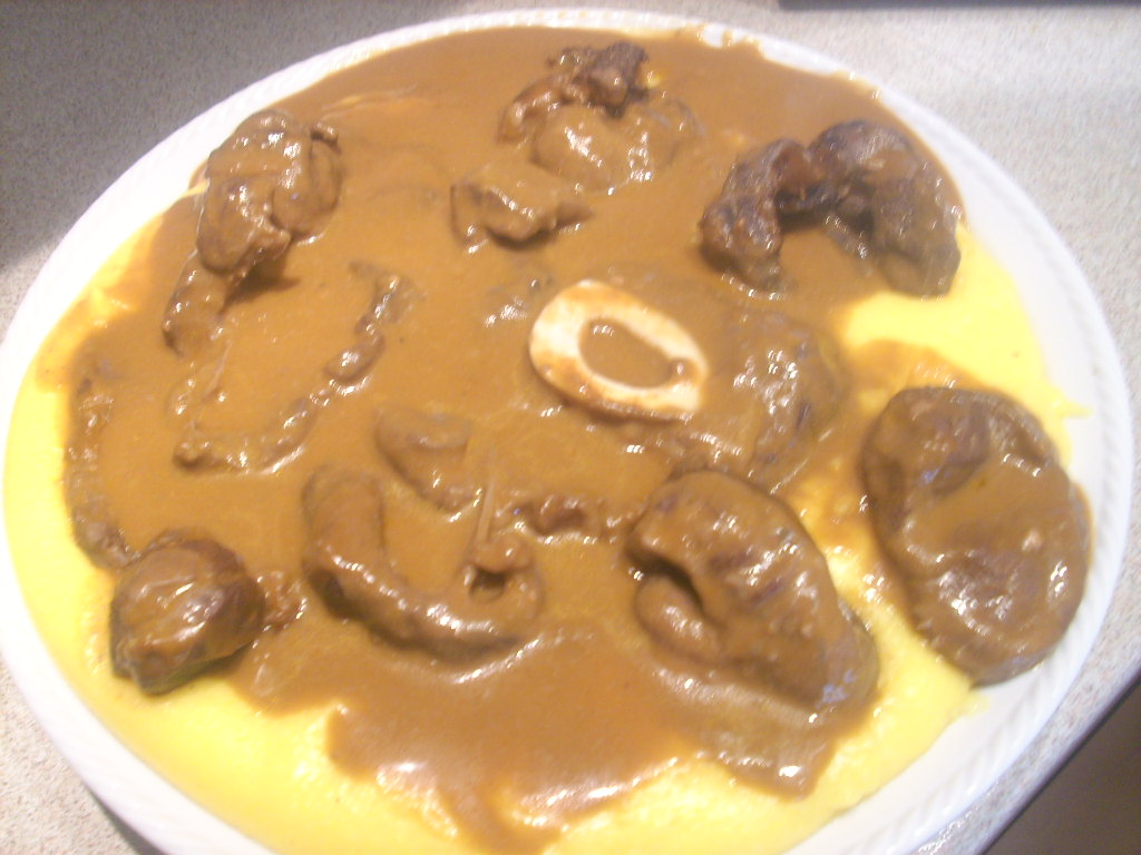 "antiorario" vel 1 e 5 min varoma.Quando è tutto cotto versare in una pirofila e preparare la polenta, poi metterla in un vassoio a bordi alti e mettere sopra gli ossi buchi con tutto il loro sughetto.