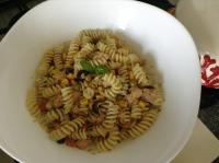adoro il surimi, il mais e le olive.. Sono andata così sul sicuro.. Ho aggiunto una scatoletta di tonno...Unica variante, non avendo in casa lo zafferano ho"sporcato" questi fusilli al Kamut con un po' di pesto al basilico...