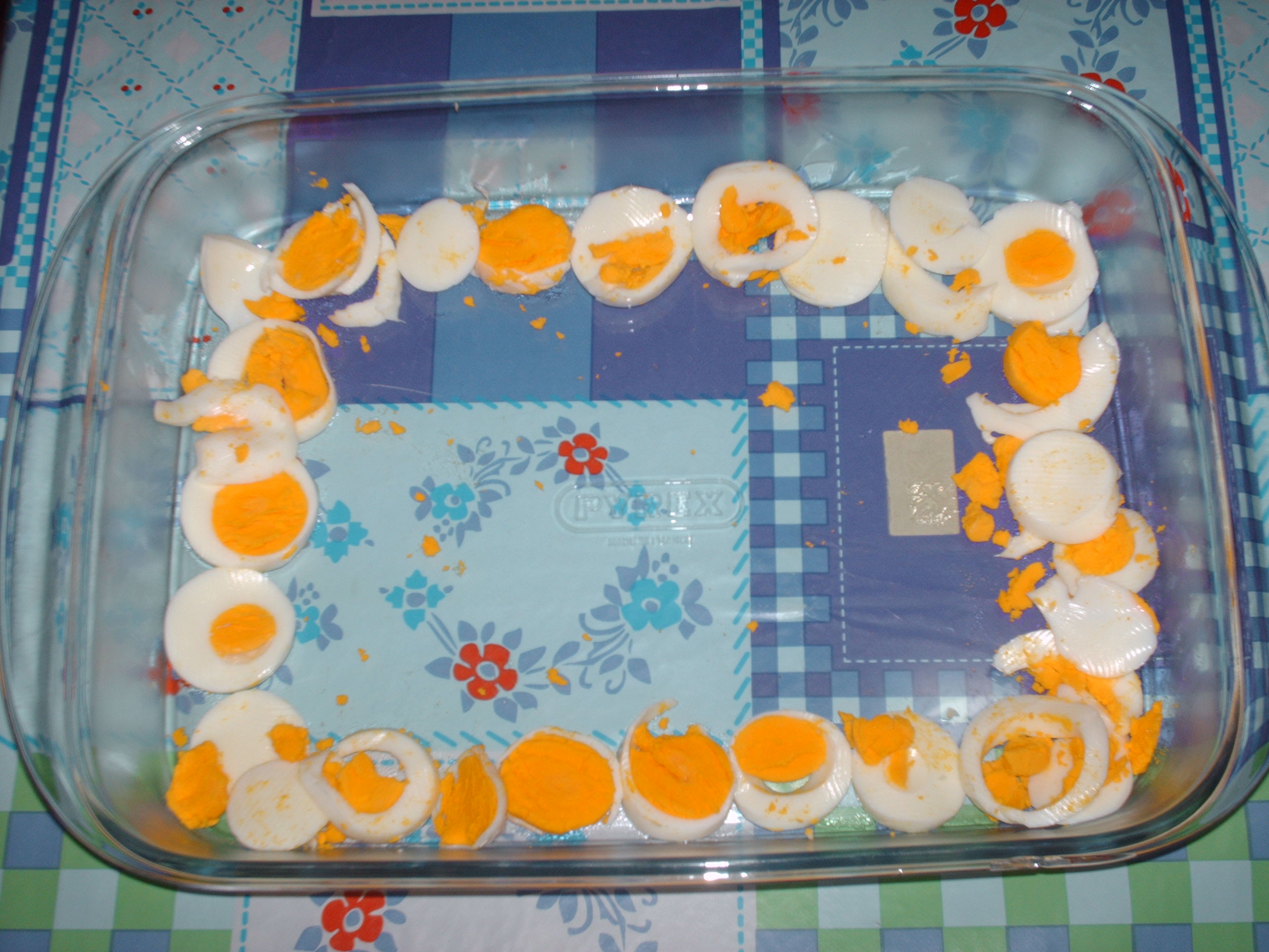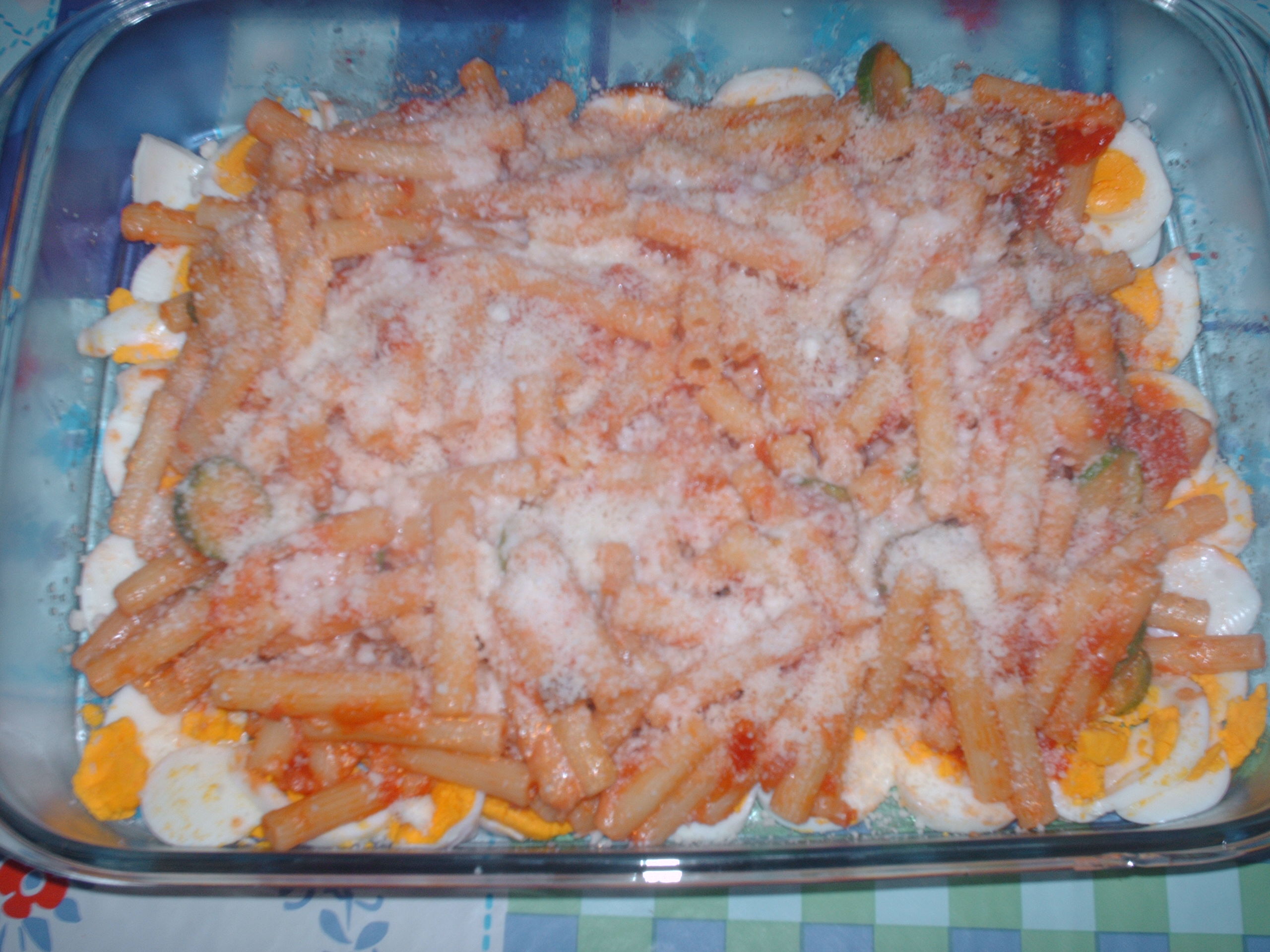 "coperchio chiuso" .Tagliare le uova sode(cotte in pentolino a parte e da quando bolle contare 8 minuti)a rondelle grandi e posizionarle ai bordi della pirofila e buttare al centro la pasta spolverizzare di pecorino grattugiato e mettiamo in forno caldo a 180° per 5 minuti.Buon appetito.