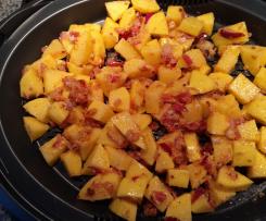 Tagliare in una ciotola le patate a cubetti, unire lo speck ,la cipolla , sale ,pepe e le spezie😍. - Versare nel contenitore e nel vassoio del varoma , 40 minuti varoma vel 1.