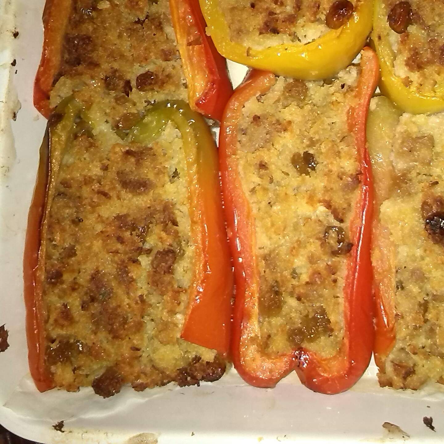 In una ciotola mettere il pane tritato precedentemente unire il resto degli ingredienti e riempire i peperoni.Mettere in una teglia un filo d' olio adagiare i peperoni e ricoprirli con un altro filo di olio.Mettere in forno e cuocere x 30/40 min a 180° .Servire e gustare tiepidi