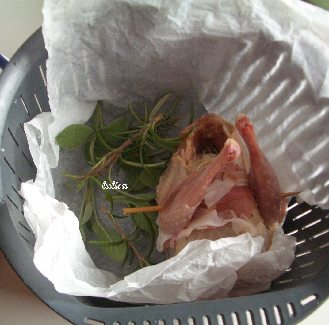 Salare l'interno e mettervi una foglia di salvia, salare e pepare anche l'esterno, bardarle con una fettina di pancetta ed infilzarle su di uno stecchino. Bagnare e strizzare un foglio di carta forno, rivestire il cestello mettere sul fondo la salvia, il rosmarino ed il timo (per chi ha il mirto sostituisce le erbe indicate con quello). Adagiarvi le quaglie e la salsiccia