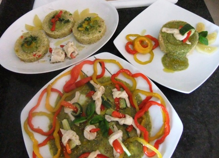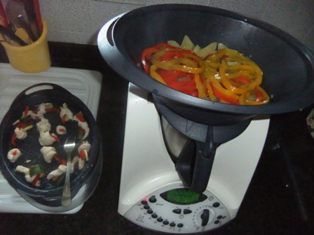 Nel Varoma sistemare le patate tagliate a piacere e sopra adagiare 110 gr. peperoni rossi e 110 gr. peperoni gialli tagliati a rondelle, olio qb, sale qb, e peperoncino; nel vassoio preparare dei nodini di petto di pollo tagliato a striscioline con filetti di zucchine e peperoni.