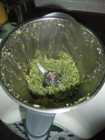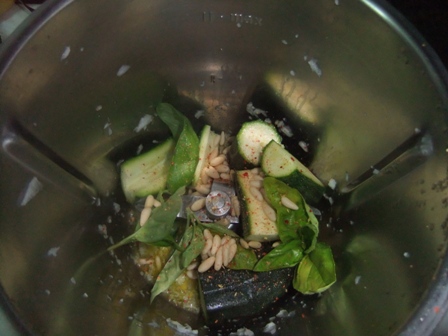 Aggiungere 2 zucchine qualche foglia di basilico, 10 gr di pinoli e tritare il tutto 15 sec. Vel. 7.