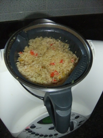 Nel cestello mettere 300gr. Di riso parboiled condito con 30 gr. di peperoni rossi e 30gr di peperoni gialli tagliati a coriandoli, salare il tutto.