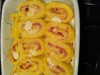 Togliere il il foglio di carta superiore e distribuire le fette di prosciutto, arrotolarlo con l'aiuto della carta e lasciarlo raffreddare.