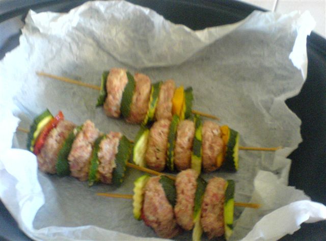 tagliare le zucchine a rondelle (16) non troppo spesse, la falda di peperone a quadrotti e preparare gli spiedini: 1 rondella di zucchina, 1 polpettina, e così via. Strizzare un foglio di carta da forno e foderare il Varoma, mettere gli spiedini