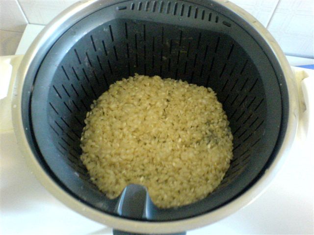 "velocità soft" , con questo olio condire il riso e preparare delle quenelle (prendere il riso con due cucchiai per darle la forma)io ho passato per alcuni minuti gli spiedini in una padella antiaderente per darle colore, ma si possono anche cuocere in forno