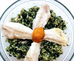 "coperchio chiuso" l'acqua, il sale, i semi di cardamomo, lo zafferano e la cannella. Posizionare il varoma e mettervi dentro i cubetti di spinaci, posizionare il vassoio del varoma e mettervi i filetti di pesce su un foglio di carta forno bagnato e strizzato, posizionare il coperchio del Varoma e cuocere 20 min. temp. Varoma vel.2. - Nel frattempo mettere in una ciotola il cuscus, aggiungere l'olio e mescolare.