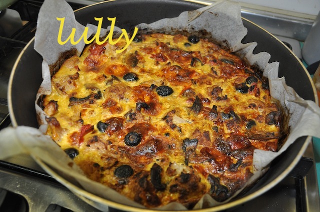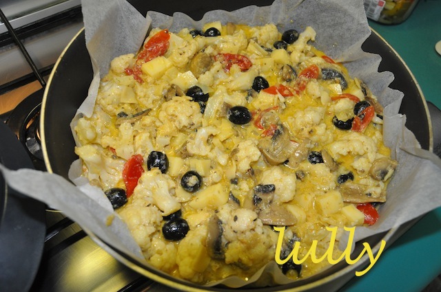 - Foderare con carta forno uno stampo rotondo da 26 cm e versarci il composto di uova e verdure;