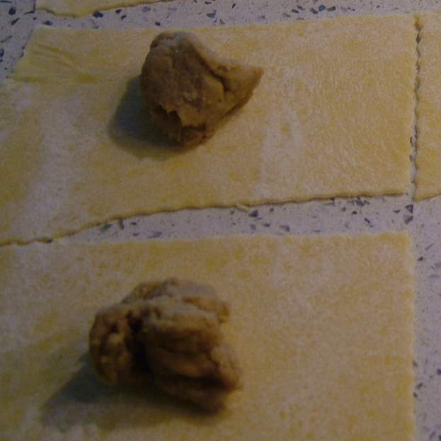 Posizionare al centro una pallina di ripieno e poi chiudere prima da una parte e poi dall'altra,spennellandola con un po' di latte per favorire la chiusura serrare i lati come una caramella.