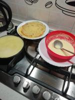 Seguire la ricetta del libro base: mettere nel boccale tutti gli ingredienti e amalgamare 30 sec. vel. 5. Versare il composto in una terrina e lasciare riposare 30 min, poi mettere in frigo ed attendere un'altra ora. Al termine, imburrare una padellina antiaderente, scaldarla e versarvi un mestolino di composto. Distribuirlo bene, cuocere da ambo i lati fino ad esaurire la pastella (a me sono venute 15 crepes).