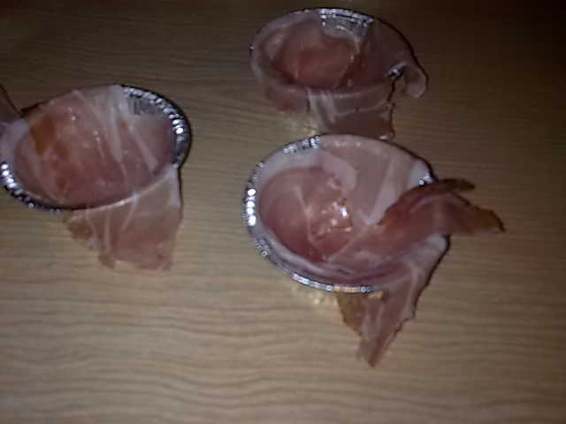 7. Intanto che il risotto si intiepidisce, rivestire dei pirottini di alluminio con le fettine di spek, avendo cura di lasciare trabordare la quantità necessaria per ricoprire il riso.