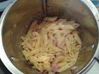 - Ad 1 minuto dalla fine controllate dal foro se la pasta vi pare cremosa e nel caso aggiungete l'acqua avanzata o parte di essa. Questo passaggio non sempre è necessario dipende dalla qualità della pasta. Tenete presente che la pasta tende ad asciugarsi subito dopo averla messa nel piatto quindi deve essere abbastanza cremosa quando termina la cottura. Servite immediatamente con una gratttata di pepe se piace.