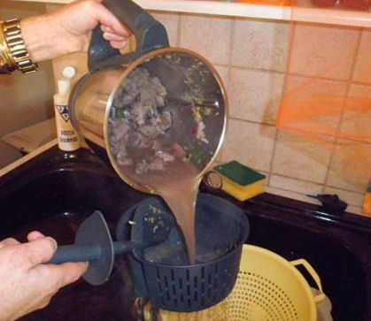 "velocità soft" .8. Servendosi del cestello, scolare la carne dall'acqua che avrà rilasciato durante la cottura e gettare via l'acqua.