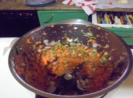 9. Nel boccale inserire il sedano, la carota, la cipolla, l'aglio, il prezzemolo, la salvia e il rosmarino, tritare: 7 sec./vel. 6. Riunire sul fondo con la spatola.