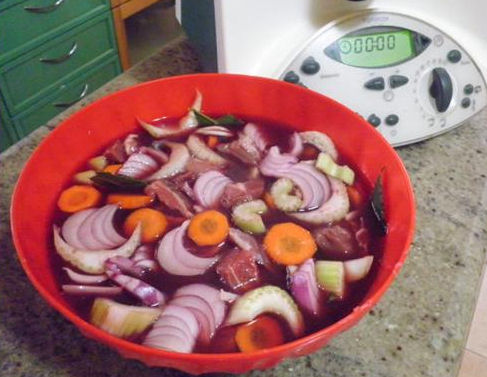 6. Tagliare a pezzettini il prosciutto di cinghiale e metterlo in infusione per una notte con il vino rosso, il sedano, la carota, la cipolla, il prezzemolo e l'alloro.