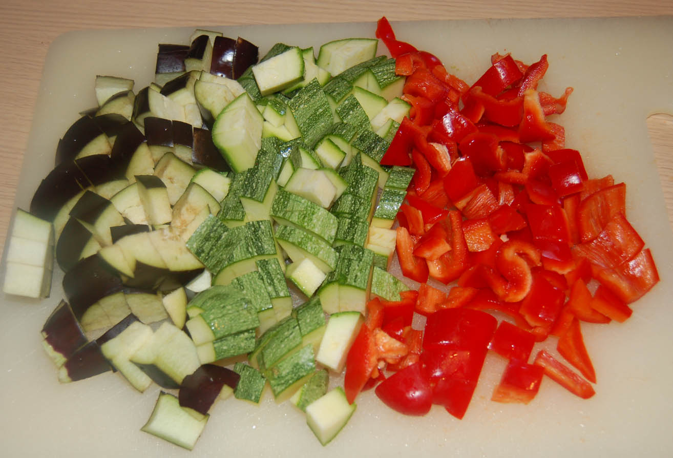 "coperchio chiuso" olio, basilico e cipolla a pezzi: 3 min. 100°C vel 1.Unire melanzana, peperone e zucchina tagliati a cubetti, sale e pepe: 7 min. 100°C vel. 1.