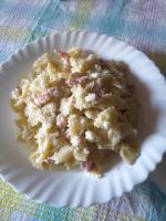 - 200 gdi pasta un po' di cipolla 40 g olio 250 g prosciutto cotto a cubetti 200 g di besciamella parmigiano, sale e pepe q.b.