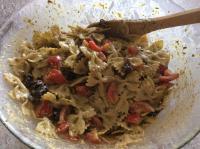 "antiorario" .a fine cottura scolare la pasta e raffreddarla sotto l'acqua fredda e metterla insieme al pesto preparato precedentemente nel piatto di portata e mescolare.