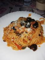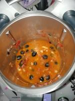 "coperchio chiuso" e rosolare 2 min. 100° vel.1Togliere l'aglio, mettere pancetta, olive, un pizzico di sale e pomodorini tagliati a metà : 5 min. 100° vel.