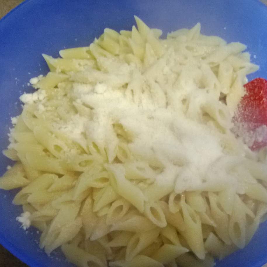 Quando la pasta sarà cotta, scolatela, versatela nella ciotola e spolverizzatela con il parmigiano reggiano.