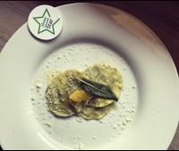 - Tirare la sfoglia con la macchinetta e al centro di ogni raviolo mettere un pezzetto di taleggio, tirare la seconda sfoglia , poggiarla sulla prima sfoglia con il taleggio e tagliare con l'apposito attrezzo i ravioli.