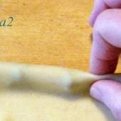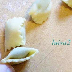 Stendere la sfoglia bella sottile, deporre il ripieno (quanto una nocciola), a 2 cm dal bordo, rivoltare la pasta su se stessa.