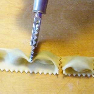 ritagliare con la rotolla la pasta in eccesso e poi con un movimento secco tagliare tra un mucchietto e l'altro, così si forma una tasca
