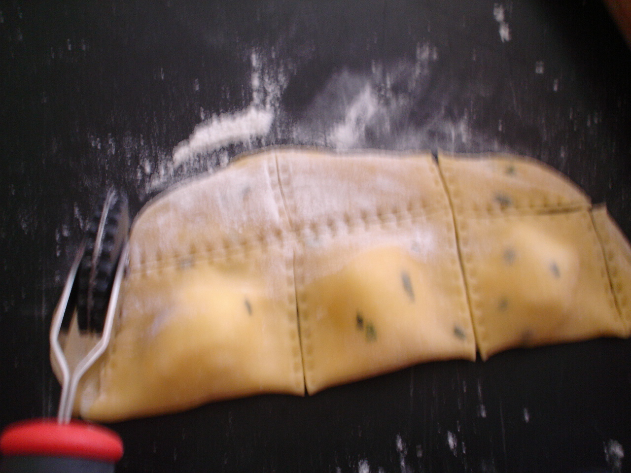 Stendere la pasta in sfoglie sottili, e procedere alla preparazione dei ravioli, allineando dei mucchietti di ripieno e ripiegando la sfoglia per chiudere. Togliere l'aria intorno al ripieno schiacciando con le dita, far aderire bene i bordi di pasta e tagliare con una rotella taglia-chiudi (oppure ripassare con i rebbi della forchetta per sigillare). Volendo si può pennellare la pasta con acqua per fare meglio saldare i bordi.