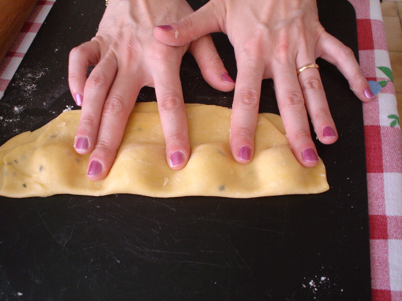 preparare la pasta all'uovo aromatizzata, versando insieme alla buccia di limone rimasta nel boccale la farina, le uova, l'erba cipollina tagliuzzata e l'olio:25-30sec vel. 8.