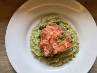 Impiattare facendo una base di salsa di avocado, poi aiutandovi con un copapast mettere uno strato di riso e uno di salmone. Guarnire con foglie di basilico.