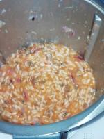 "antiorario" / vel.1; aggiungere le vongole con la loro acqua, i pomodori pelati e 280 g di acqua (con dado bimby) calda, cuocere senza misurino 16 min. 100°/