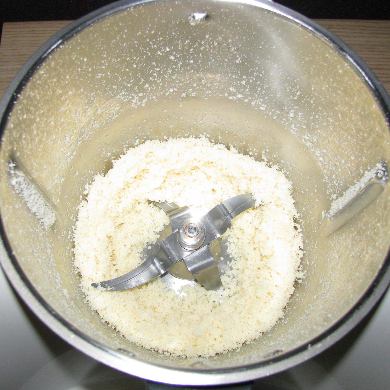 Tritare grana e mandorle o pinoli per 20 secondi a velocità 9 (arrivarci gradualmente).