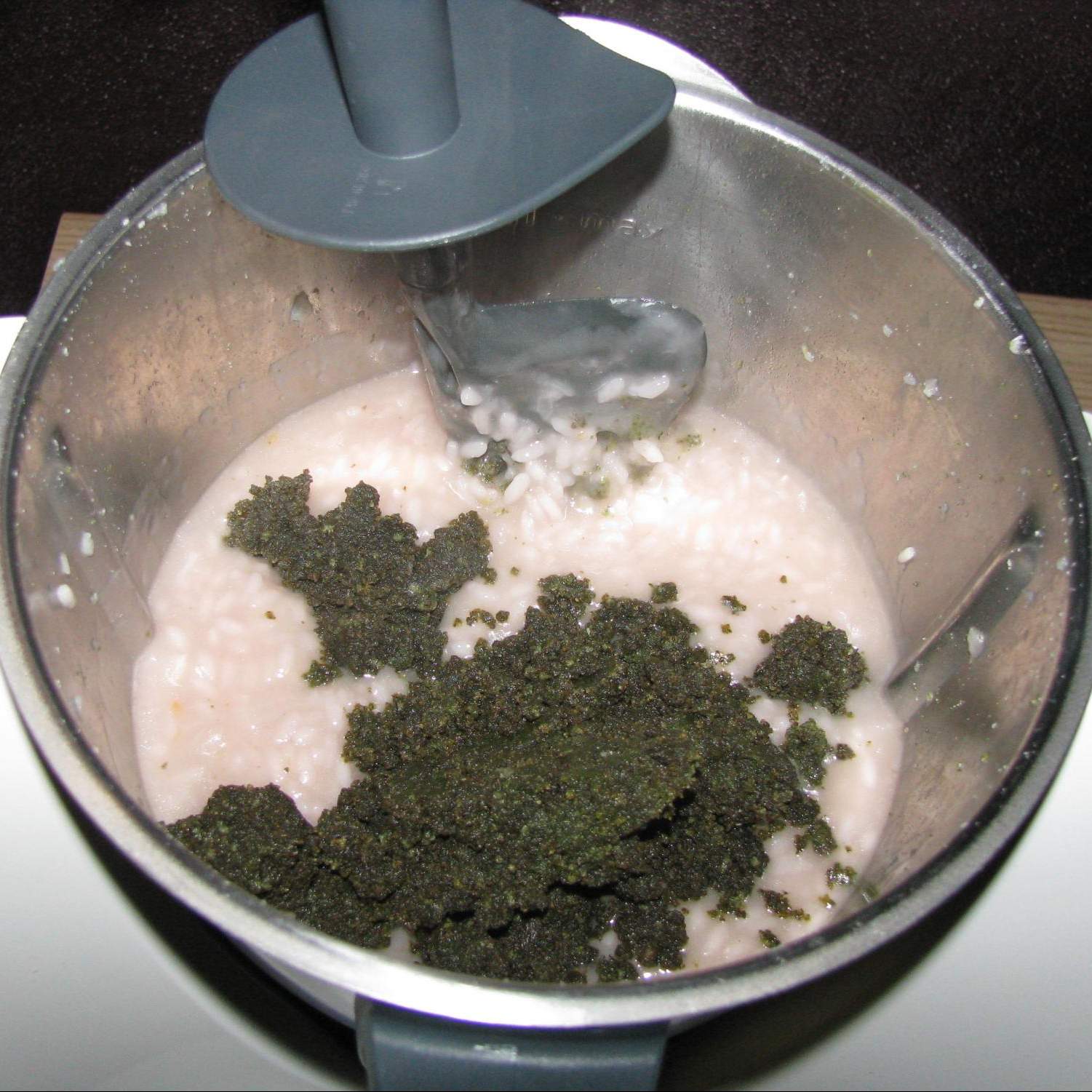 Aggiungere acqua bollente e sale o dado; 15 minuti, 100°, velocità 1, antiorario, senza misurino. Anche qui si raccomanda di non esagerare con il sale, visto che poi bisognerà aggiungere il pesto.