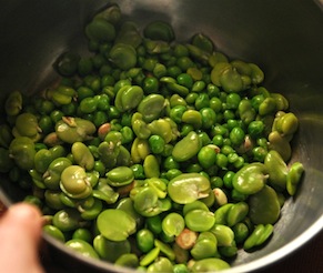 - Nel frattempo che cuociono le carote, pelare le fave dalla loro pellicina e unirle ai piselli nella terrina che sara' messa di lato.