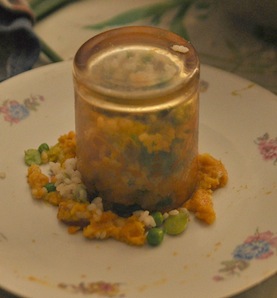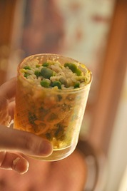 - Prendere i piatti di portata, spalmare al centro un po di crema di carote, prendere un bicchiere e riempirlo di riso condito, aspettare qualche secondo e poi rovesciare velocemente al centro del piatto sul letto di carote, tirate via il bicchiere delicatamente, vedrete che il riso resterà "in piedi".