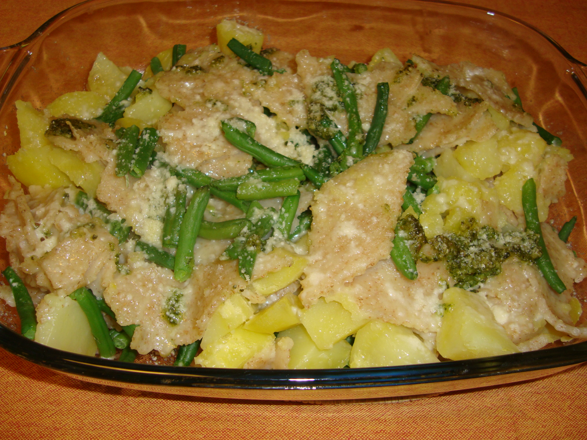 "coperchio chiuso" acqua per circa 750gr leggermente salata, inserire il cestello nel boccale e introdurvi i fagiolini puliti e spuntati, chiudere il coperchio, posizionare la campana del Varoma in cui avremo inserito la patata a tocchetti, chiudere con il coperchio del Varoma: 20 minuti temp. Varoma vel.2. Attenzione alla cottura dei fagiolini, che dovrebbero essere pronti dopo solo 15 minuti. Dopo aver completato la cottura a vapore delle verdure, inserire nell'acqua già presente nel boccale i tedstaroli tagliati precedentemente per 2 minuti. Scolare i testaroli. Diluire il pesto con 1 cucchiaio di acqua di cottura.Ungere una teglia da forno con olio e.v.o. distribuire uno strato di testaroli, pesto, verdure a vapore, formaggio grattugiato. Ripere eventualmente gli strati, spolverare a finitura con formaggio grattugiato, alcuni pinoli a guarnizione secondo i gusti personali, un giro di olio se piace.