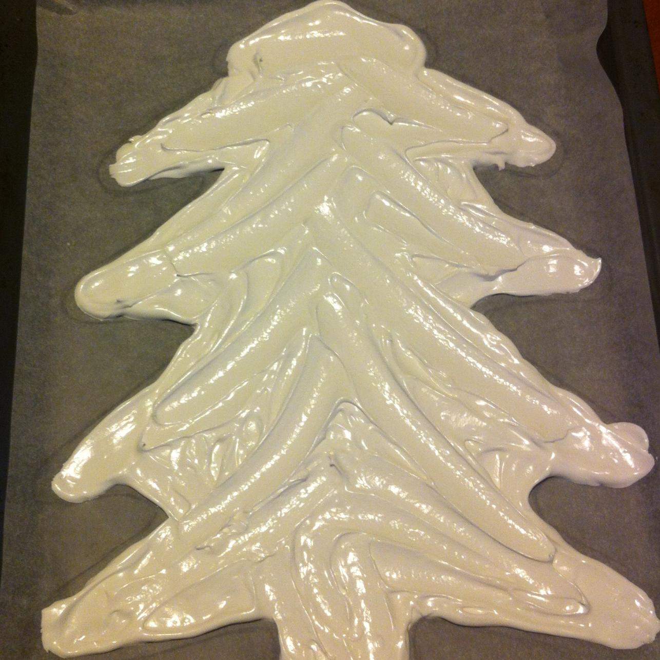Nel frattempo, con una matita, disegnare su un foglio di carta da forno, la sagoma di un albero di Natale. Capovolgere il foglio su una teglia in modo da far rimanere il tratto della matita non a contatto con l’alimento da cuocere.