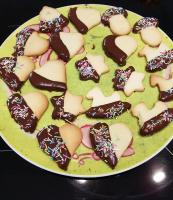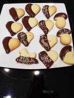 Una volta raffreddati i biscotti, ho sciolto a bagnomaria del cioccolato fondente ed ho immerso metà biscotti dentro.