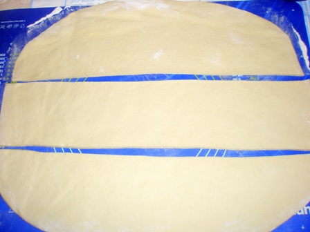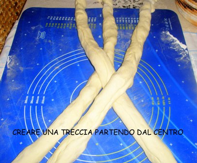 Stendi la pasta in un rettangolo,taglia tre strisce e su tutta la superficie spalma con il ripieno arrotola le strisce formando dei cilindri e
