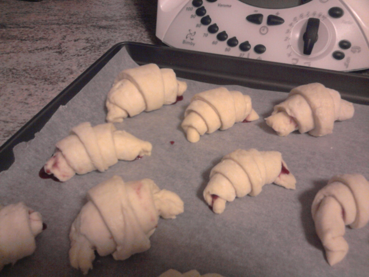 Riprendere l'impasto e lavorarlo con il mattarello formando un quadrato più grande della margarina. Appoggiare sopra l'impasto il panetto di margarina chiudendo tutti i lembi della pasta per incorporare il panetto di margarina. Stirare con il mattarello la pasta fino a farlo diventare un lungo rettangolo, piegarlo in tre parti e ripetere l'operazione per almeno 3/4 volte. Tirare la pasta fino ad avere una sfoglia abbastanza sottile. Tagliare dei triangoli. Nella parte più larga dei triangoli mettere la marmellata o il cioccolato e arrotolare per formare dei cornetti. Metterli in una teglia ricoperta con carta forno e lasciare lievitare per circa 1 1/2. Spennellarli con un uovo, ricoprirli con qualche granella di zucchero e infornare a 180° (forno ventilato) per circa 20 min. controllando la doratura.