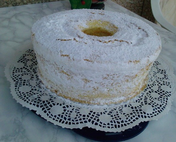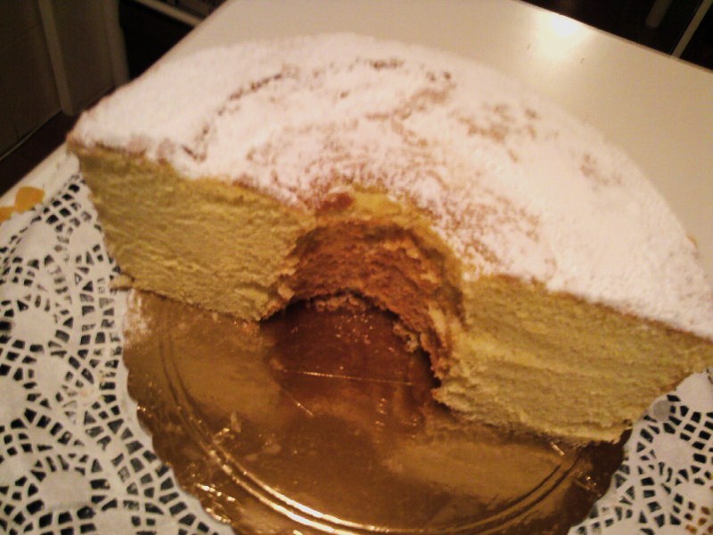 - La torta crescerà tantissimo, a fine cottura farla raffreddare capovolta lasciandola nel suo stampo: se lo stampo è quello originale con i piedini è sufficiente appoggiarla su un piano, altrimenti infilatela capovolta sul collo di una bottiglia e lasciate raffreddare completamente (circa 2/3 ore);