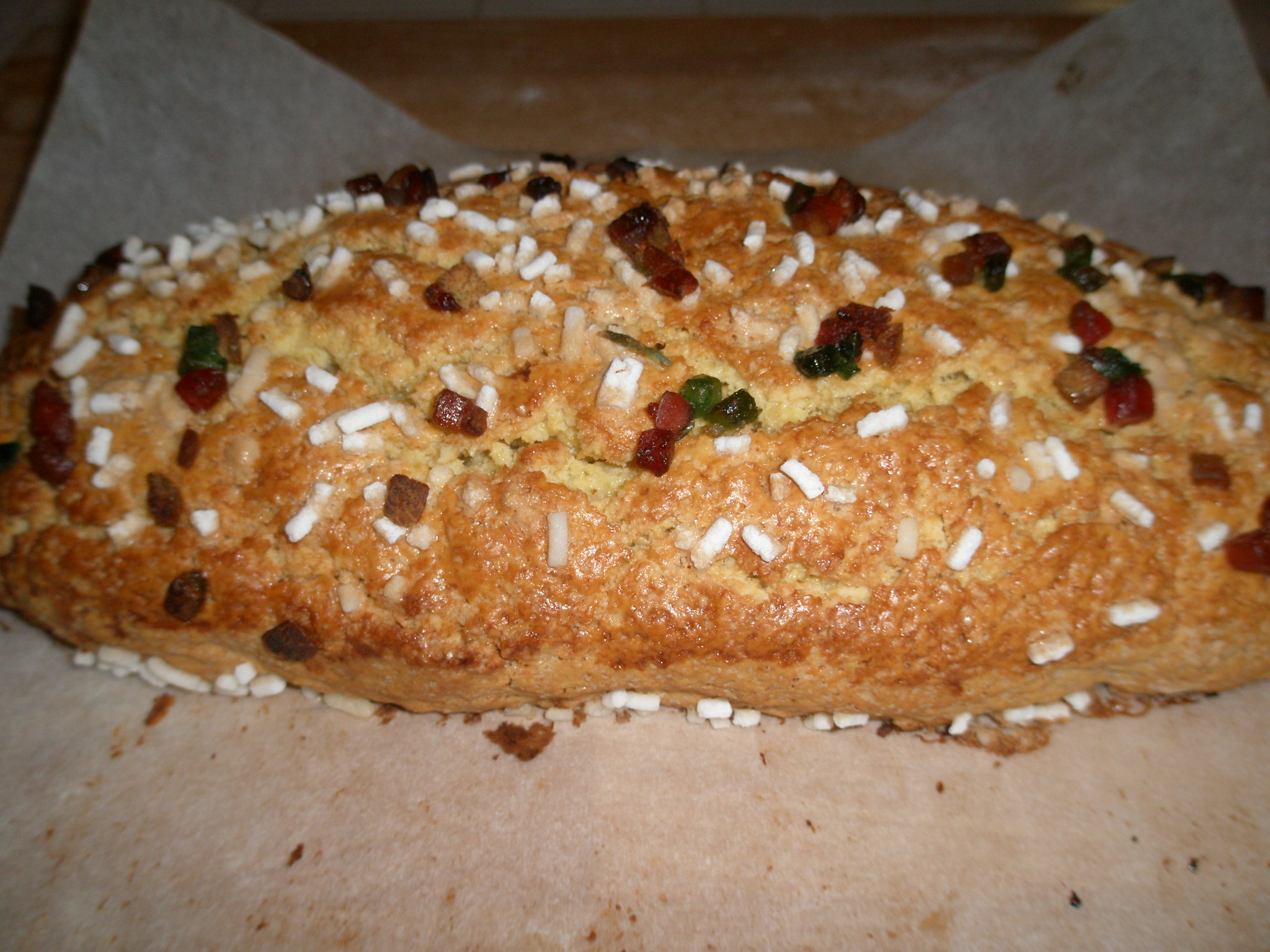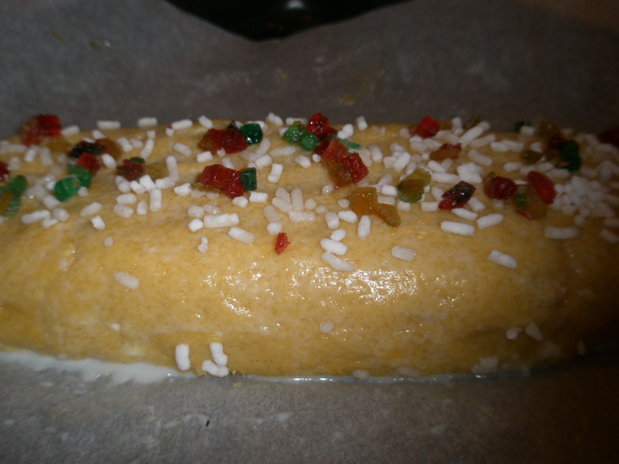 Spennellare con del latte l'intera superficie del filoncino e cospargere di granella di zucchero e qualche candito.