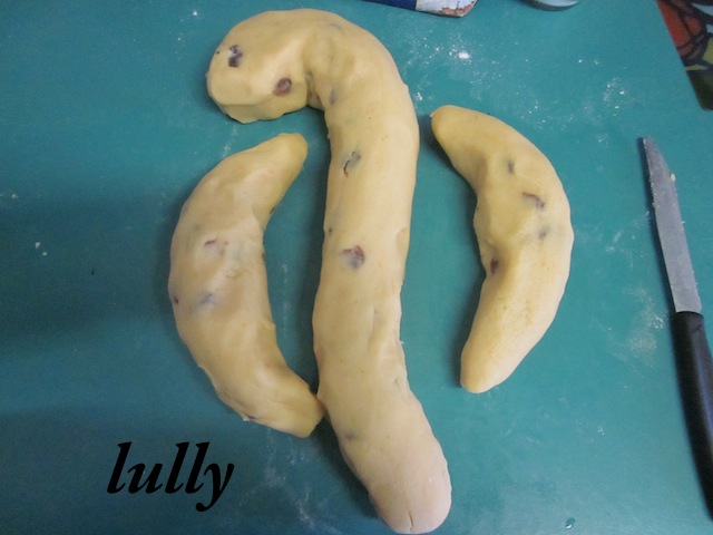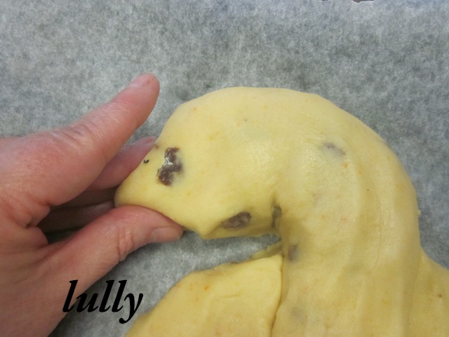 con la parte più grande fare un filoncino, appoggiarlo sulla placca del forno foderata con l'apposita carta, dandogli una forma tipo S.
