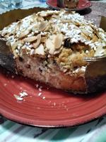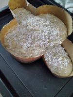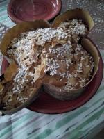 Versare  il tutto in uno stampo da colomba,  ricoprire con lo zucchero di granella e appoggiare sopra le mandorle bianche delicatamente.
